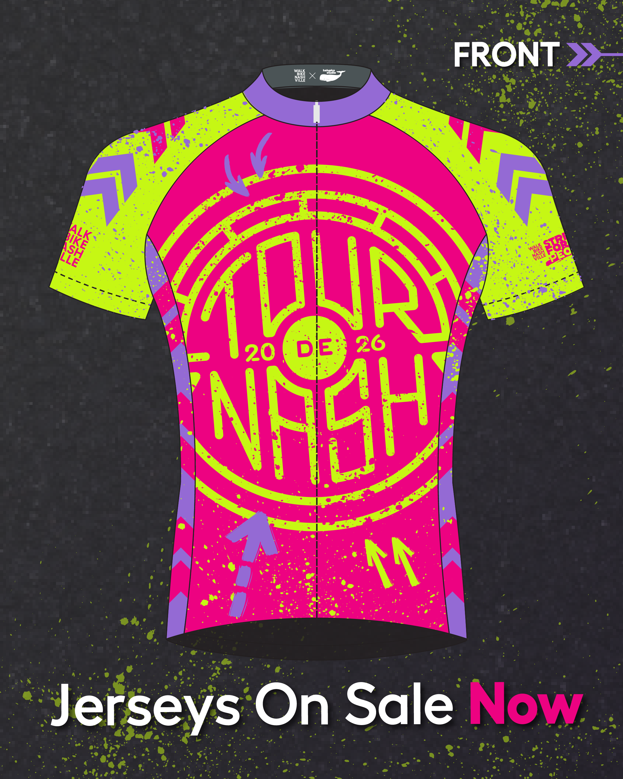 Tour de Nash 2026 jerseys are on sale now! Place your order by 11:55 p.m. on April 2 to make sure yours arrives in time for you to rock it on ride day. Your purchase helps support our mission to build great streets and a strong culture of walking and biking in Nashville.